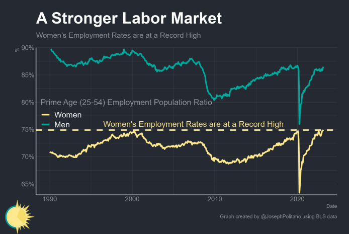조이 폴리타노(Joey Politano)는 주요 연령대 여성의 고용률이 현재 사상 최고치를 기록하고 있음을 보여주는 훌륭한 차트를 작성했습니다: