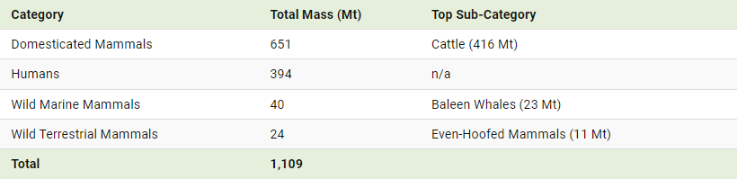 이 데이터에서 가장 분명한 시사점 중 하나는 인간이 전체 포유류 바이오매스의 3분의 1을 차지한다는 것입니다.
