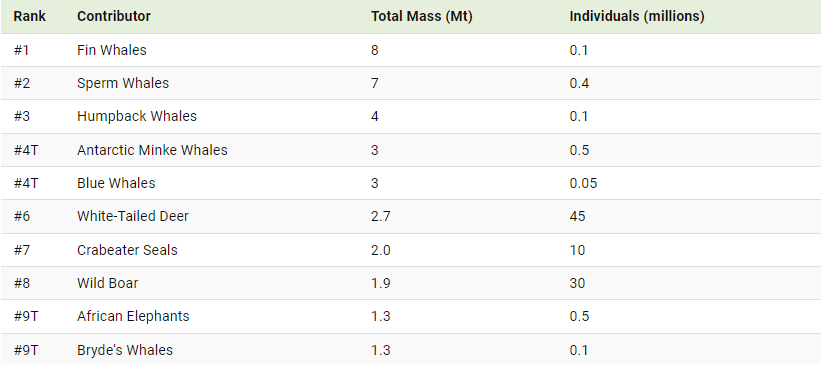 아래는 자연계의 바이오매스에 기여하는 야생 포유류 상위 10종입니다.