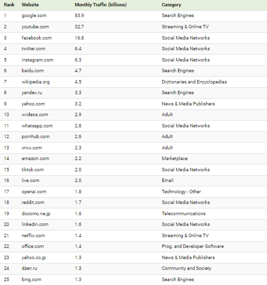 2023년에도 알파벳과 페이스북이 소유한 웹 사이트가 수년 동안 그래왔듯이 상위 25위권을 차지했습니다. 실제로 구글, 유튜브, 페이스북, 인스타그램, 왓츠앱을 합치면 상위 25개 목록의 총 트래픽의 4분의 3을 차지합니다.
