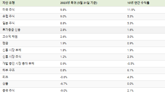 5월 31일 기준 2023년 일부 자산 클래스의 수익률은 다음과 같습니다: